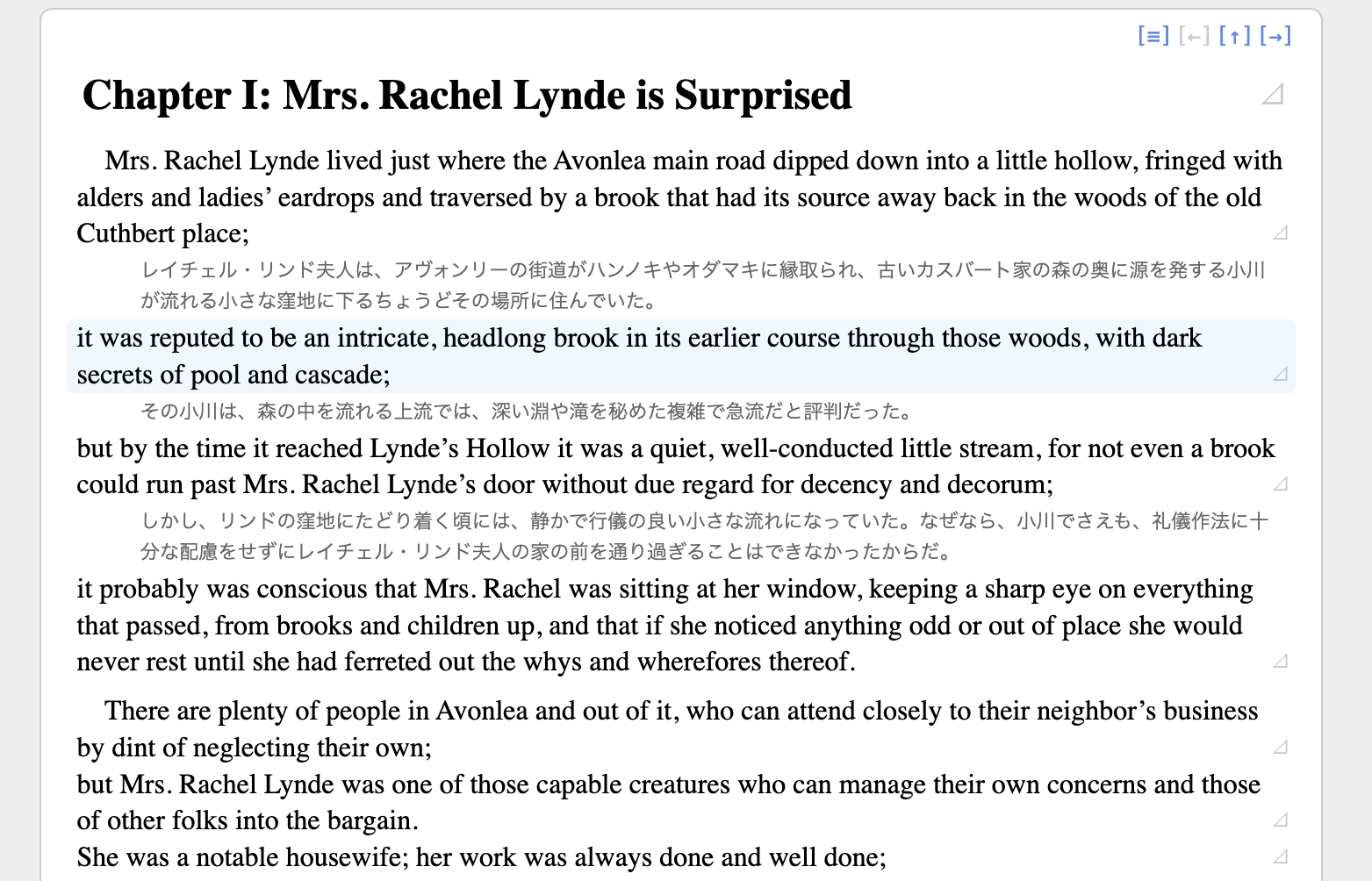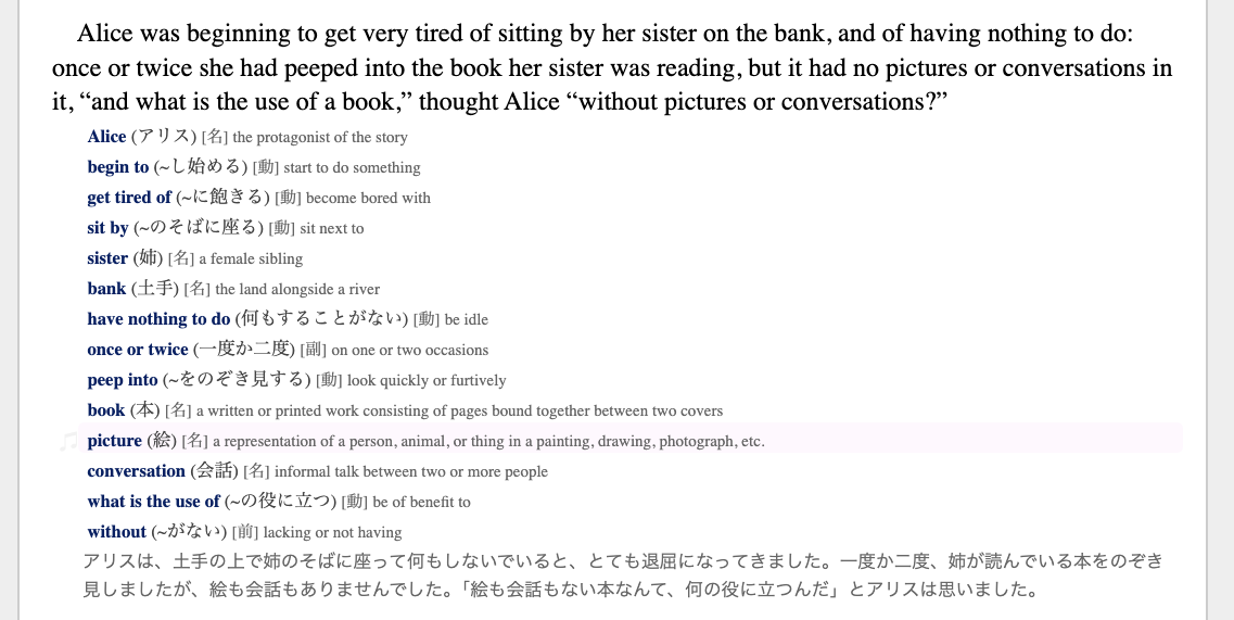 本文のページの右上にある [≡]アイコンをクリックすると、全ての訳文を隠すことができます。その状態で、各文の右にある [⊿]アイコンをクリックすると、その文の訳文が表示されます。原文の読解に集中しつつ、解釈に困った場合だけ訳文を読みたいという場合にはこのモードを使うと良いでしょう。また、原文と訳文の各文の右側に半透明の [🎵]アイコンが隠されていますが、それをクリックすると、その文の自動音声読み上げができます。発音を確認したい場合に便利です。