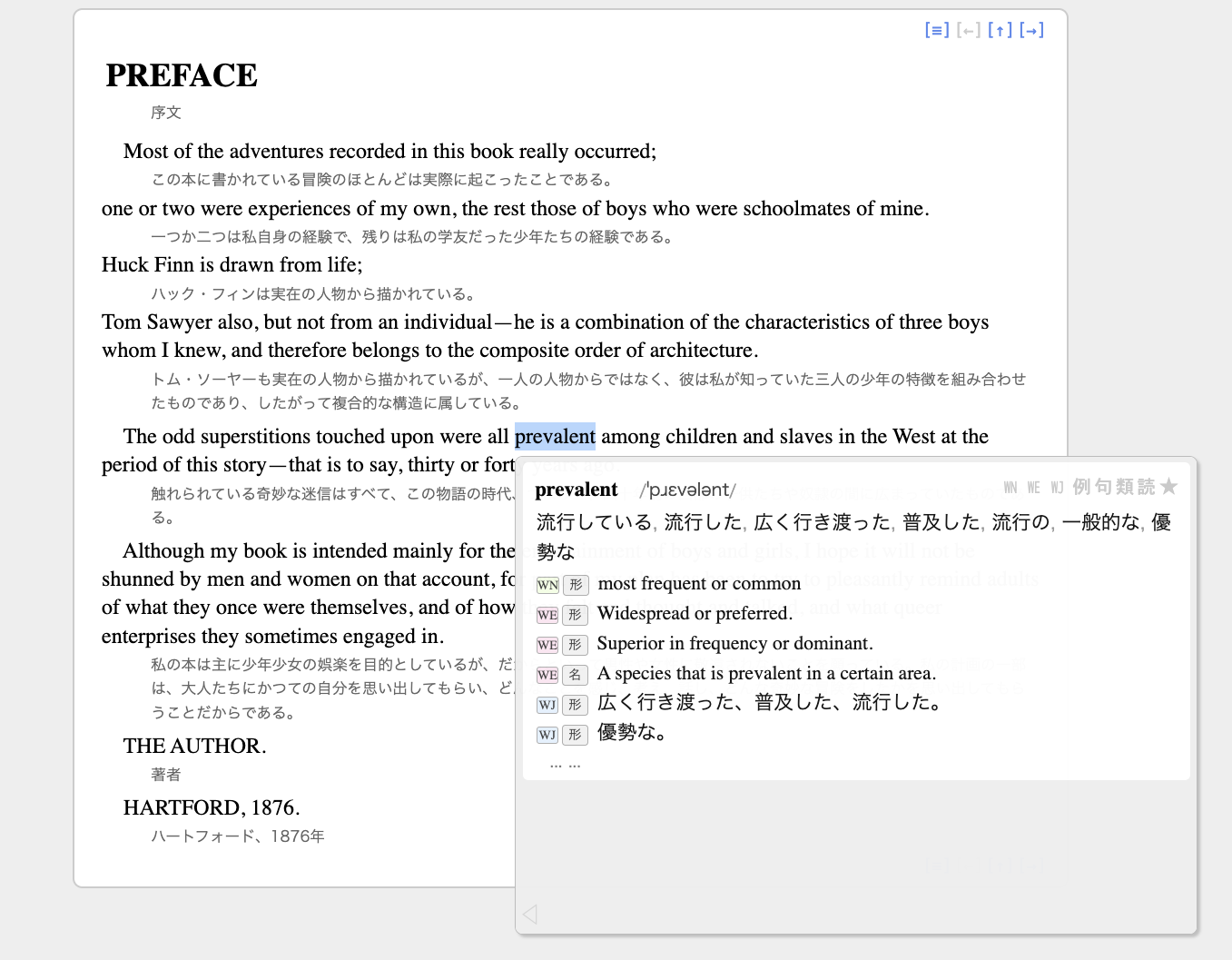 ポップアップの英和辞書機能も組み込まれています。意味や例文を調べたい語句が本文中にあれば、その語句をダブルクリックやドラッグで選択すると、その英和辞書でそれを検索した結果がポップアップとして表示されます。これは統合英和辞書の機能を流用したものです。